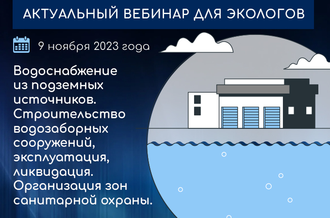 - Вебинар посвящен практическим вопросам организации водоснабжения из подземных источников для питьевых, санитарно-бытовых и технических целей: строительство, оборудование, содержание, эксплуатация и ликвидация водозаборных сооружений; организация зон санитарной охраны; лицензирование.